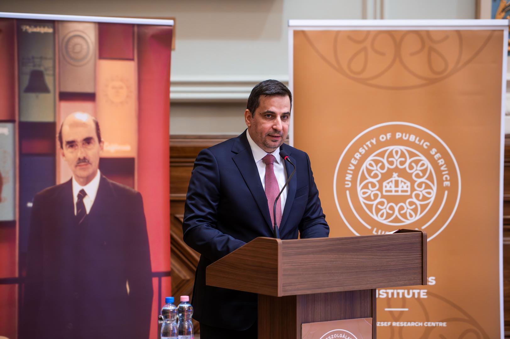 Deli Gergely, az NKE rektora köszöntőjében kiemelte, a jelen konferencia újabb lehetőséget teremtett arra, hogy közösen áttekintsék a világhírű történész szellemi örökségét, valamint magyar és amerikai identitásának jelentőségét. Hangsúlyozta, hogy munkássága és gondolkodása különösen fontos az NKE számára, amely tudatosan ápolja John Lukacs szellemi örökségét: egyebek mellett 2021 decemberében nyílt meg az egyetem Szárnyépületében a John Lukacs Társalgó, ahol a történész személyes tárgyai, könyvei és kéziratainak egy része is megtekinthető. Ezt követően 2022-ben konferenciát rendeztek John Lukacs és az amerikai konzervativizmus címmel, majd 2024 januárjában a Szellem és jellem című tanácskozáson emlékeztek meg születésének századik évfordulójáról. Ezzel párhuzamosan az egyetemen megalakult a John Lukacs Intézet, amelynek egyik fő célja Lukacs szellemi hagyatékának gondozása és továbbadása. Deli Gergely emlékeztetett, hogy John Lukacs 1944-ben, fiatalon hagyta el Magyarországot családjával együtt, ám identitásában mindvégig megmaradt magyarnak. Ezt fejezi ki az a gondolat is, amely az idei rendezvény mottójává vált. Hangsúlyozta, hogy történetírói szemlélete új hangsúlyokat hozott a 20. századi historiográfiába: az egyén, a személyiség és a mentalitás szerepét állította a történelmi elemzés középpontjába, hidat képezve Európa és Amerika gondolkodása között, és történetírása ma is iránymutató.